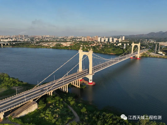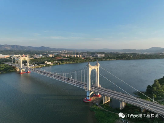 易游官方网站承接的2022年赣州市中心城区8座桥梁结构定期检测中的赣州大桥,桥长1073米,主桥跨度408米,由东西岸引桥和主桥组成,其中主桥为双塔重力式锚碇悬索桥,主梁采用全封闭钢箱梁。桥梁宽度32.4米,双向四车道。