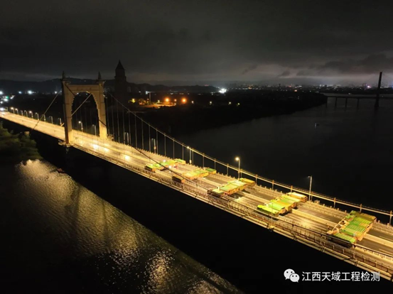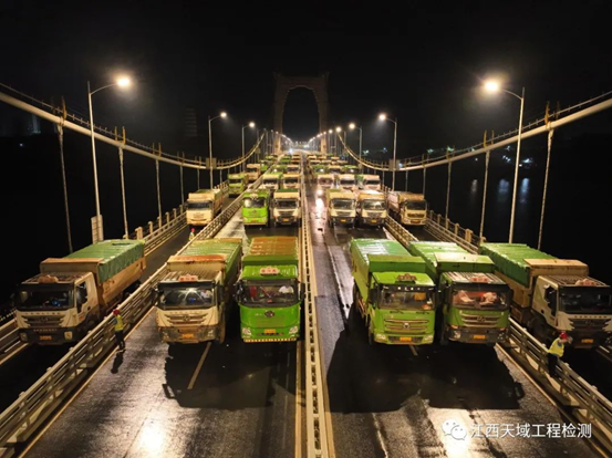 此项目规模较大、任务艰巨,从桥梁外观检查、实体检测到荷载试验,历时28天,其中,引桥及主桥荷载用时五天四晚,最大工况加载采用了42辆加载车(每辆车重32吨,总重量共1344吨),于2023年7月18日早晨顺利完成全桥结构荷载试验!