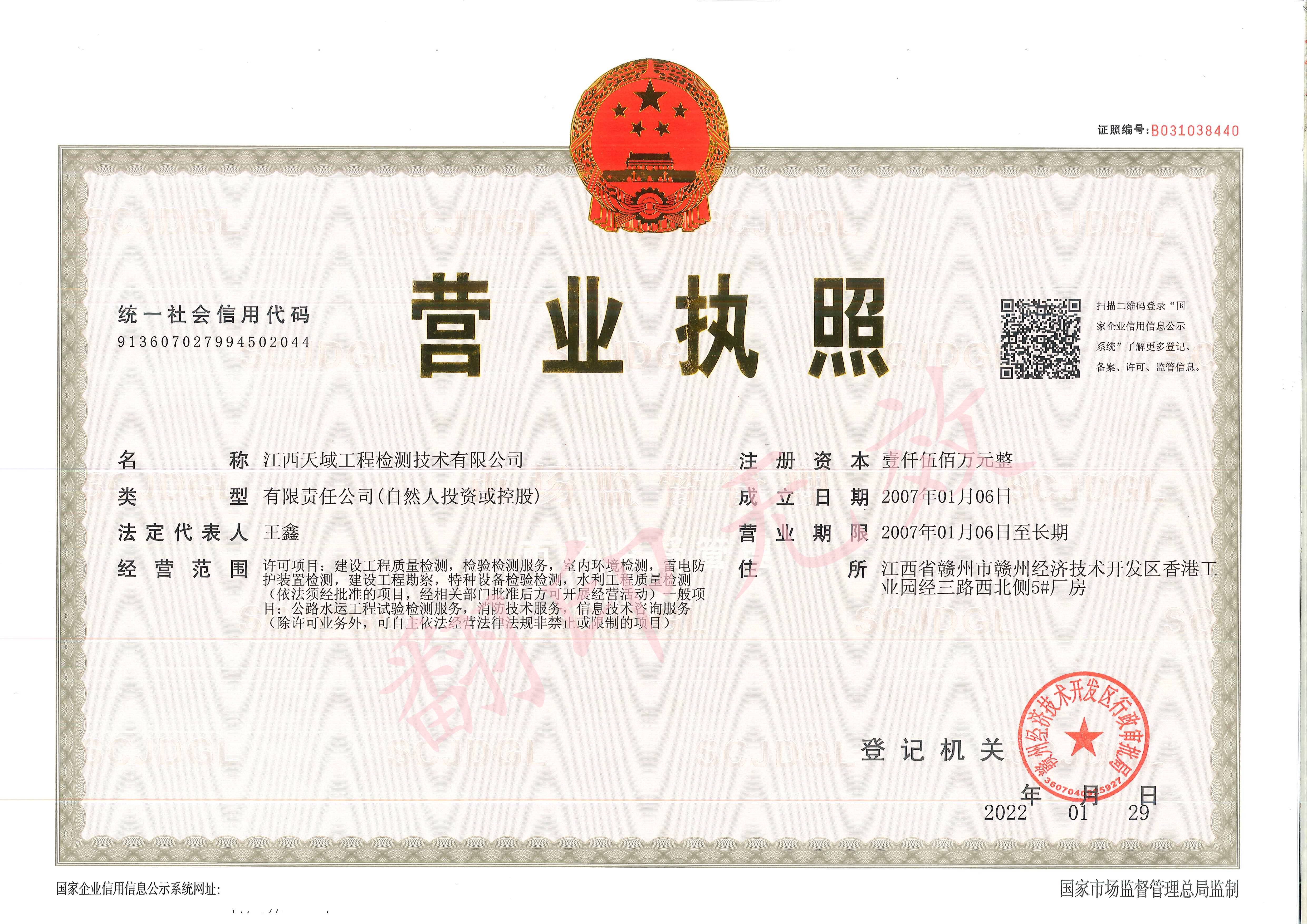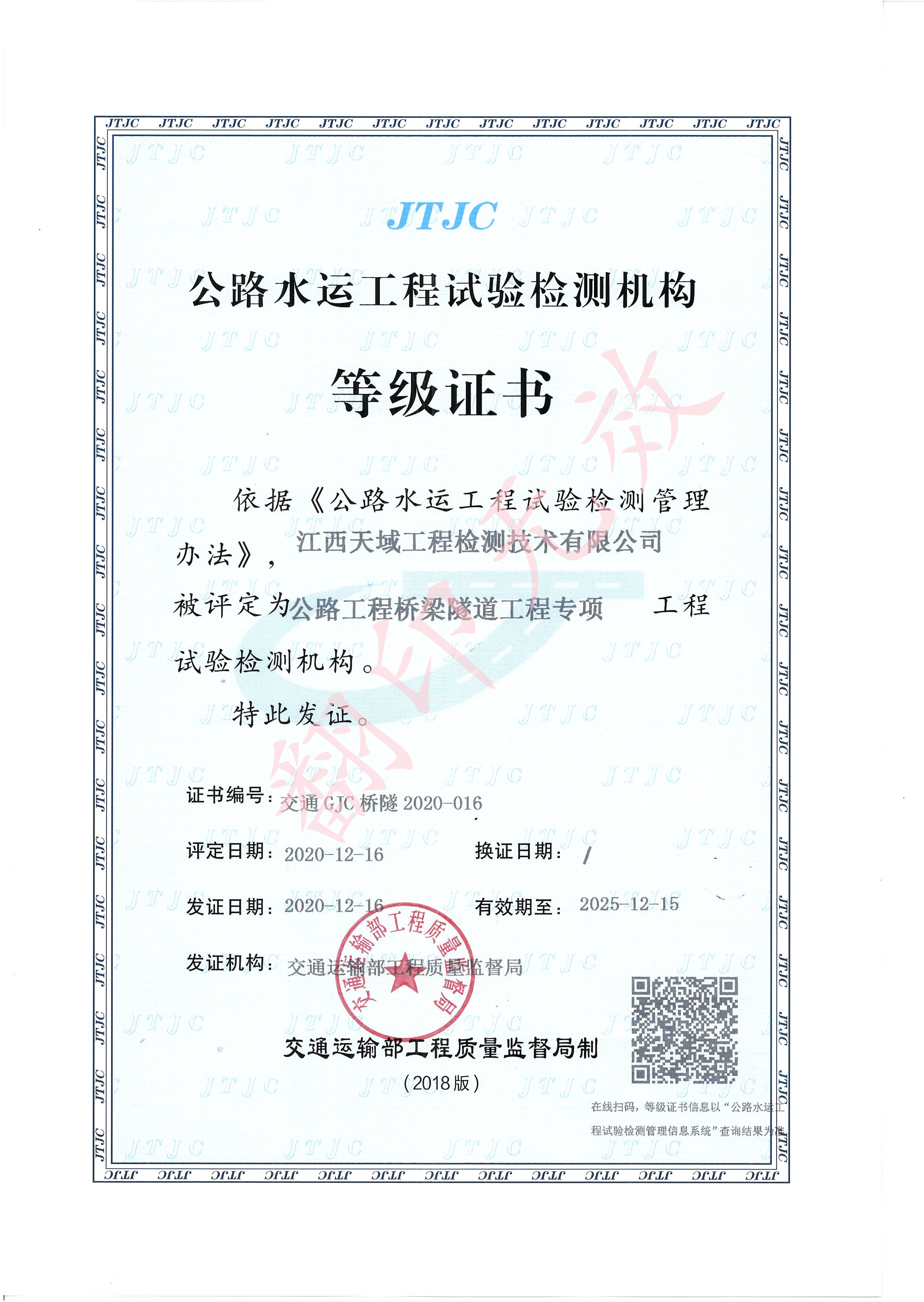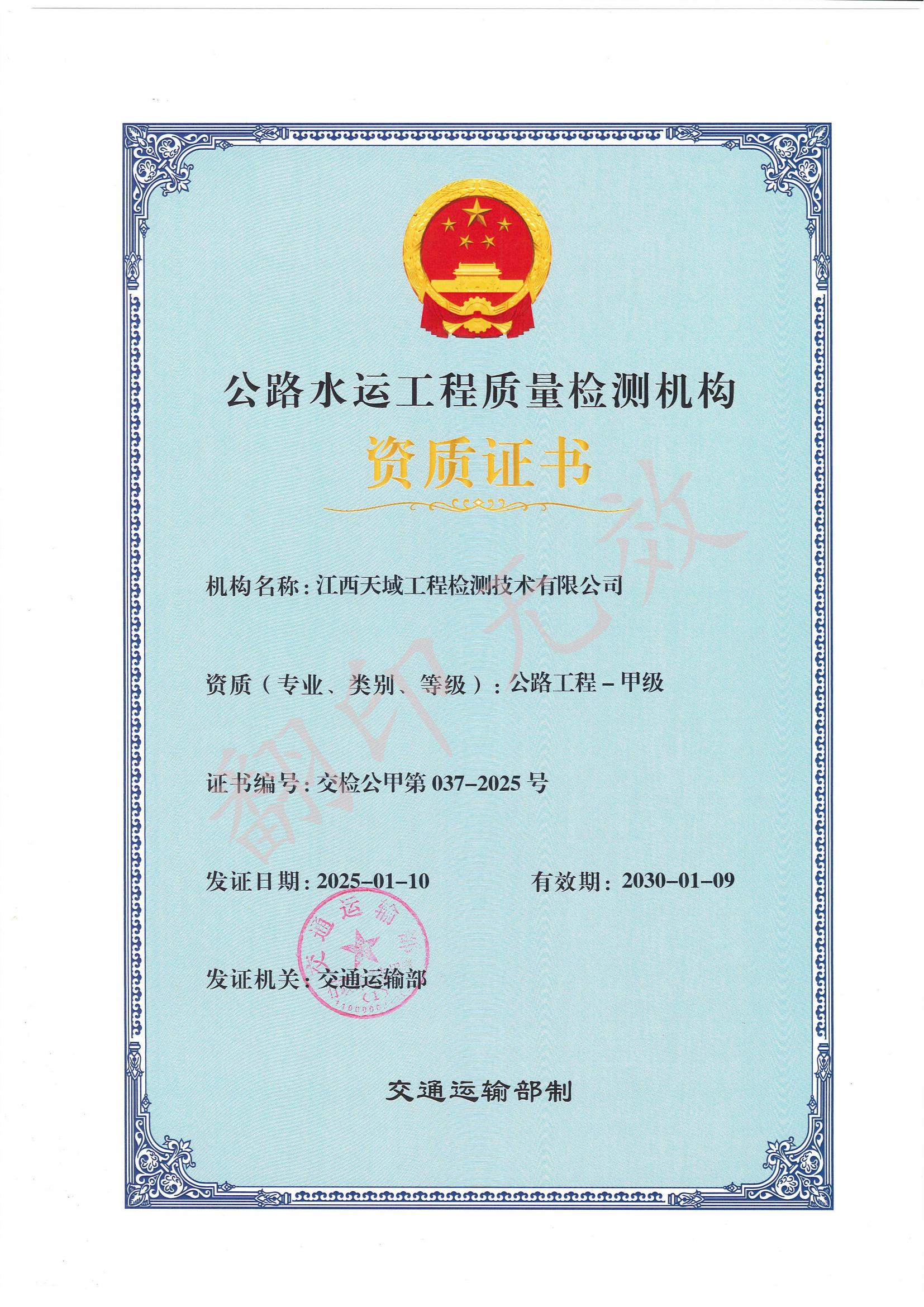 公路工程甲级检测资质证书