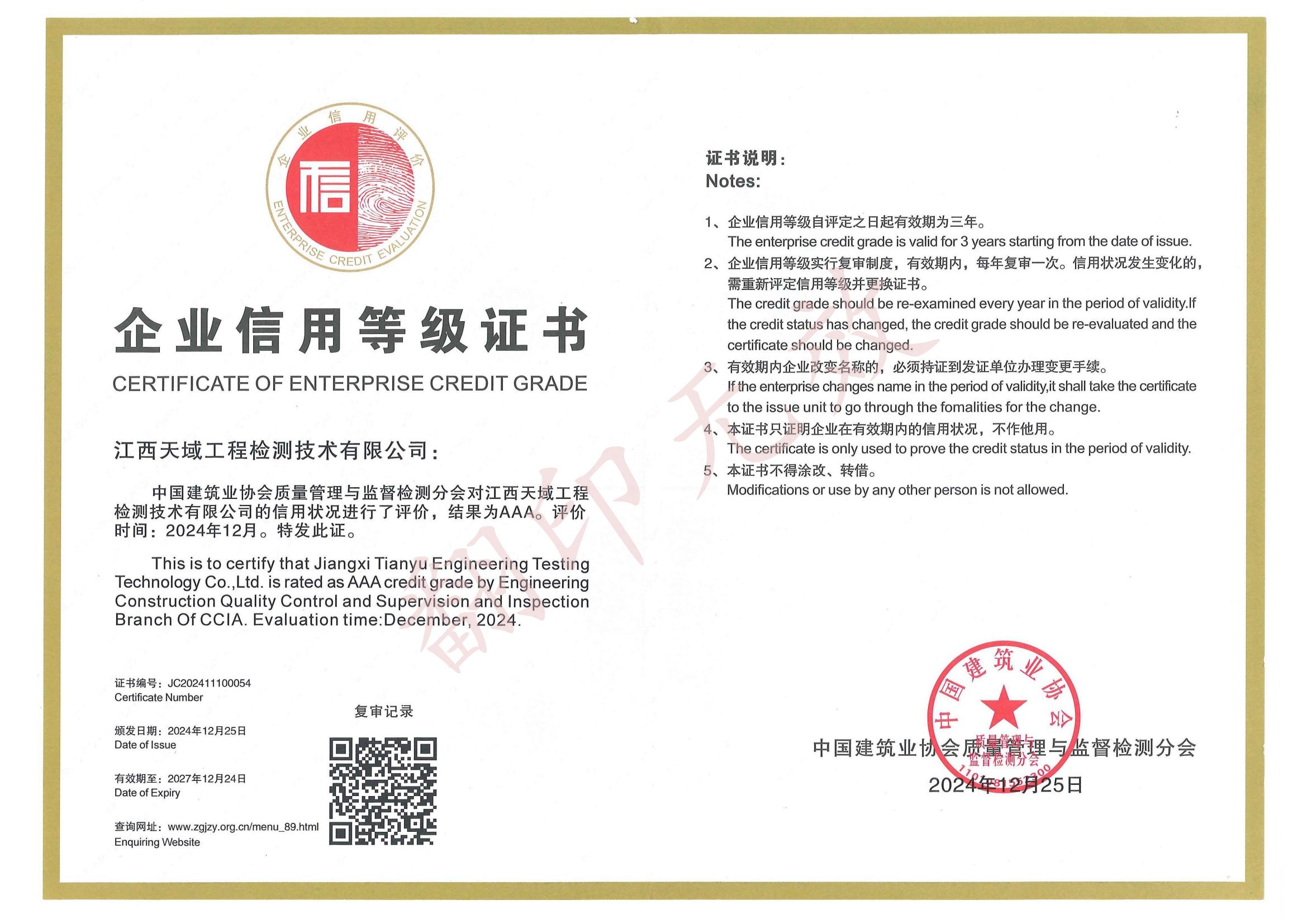 全国建筑业企业信用等级证书