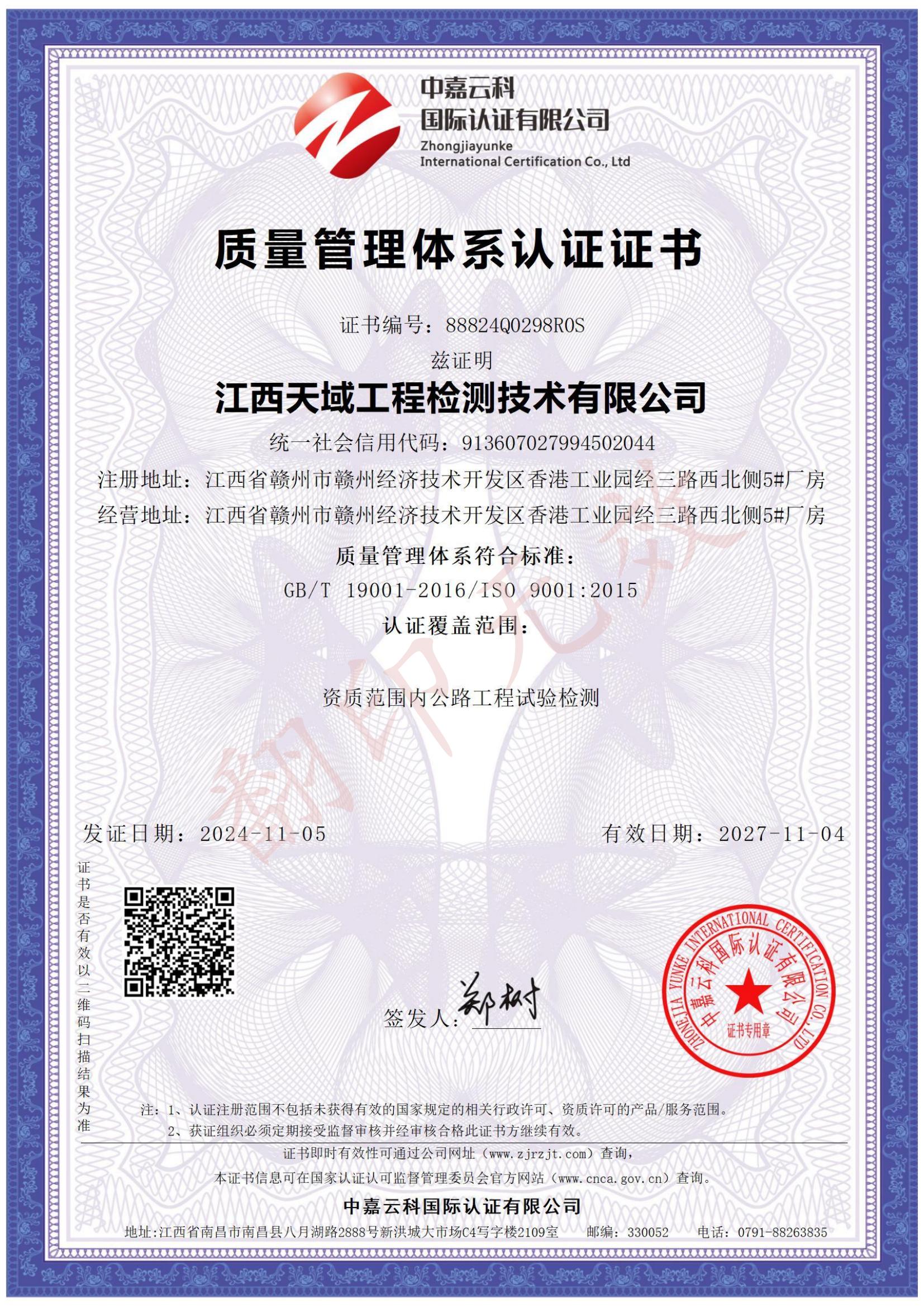 质量管理体系认证证书